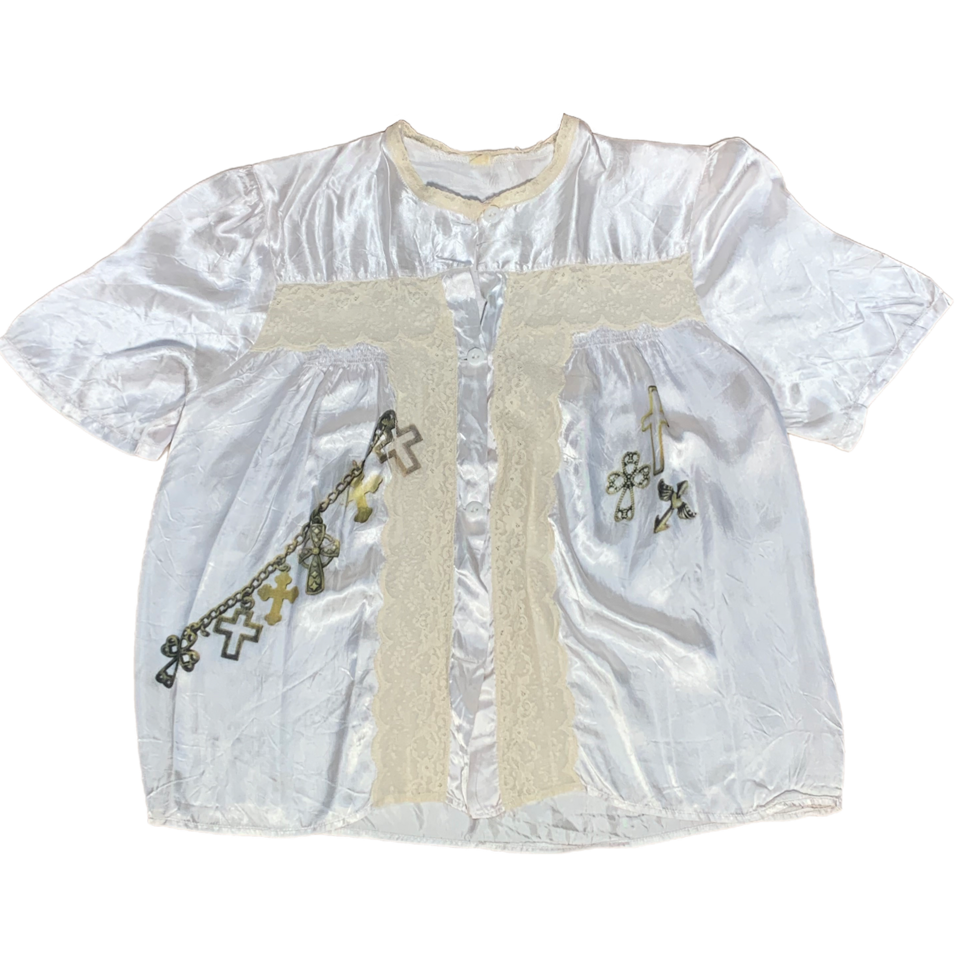 Vintage silk button up top with hand printed Groovy Pearlz necklace and charms. Top has lace trim detailing and button closure. Would fit size small-medium best