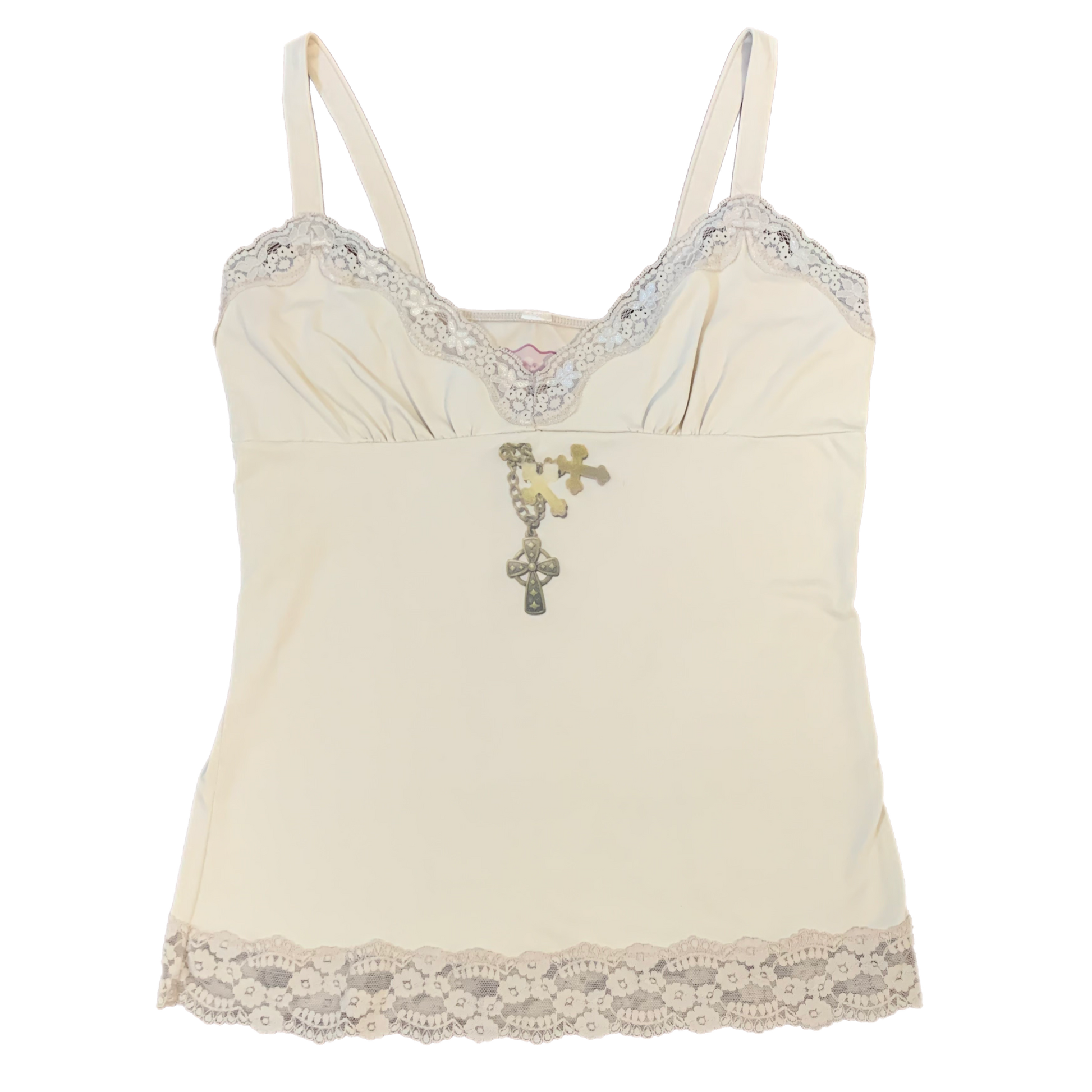 Tan cami tank with hand printed Groovy Pearlz charms. Tank has lace trim detailing. Would fit size medium best
