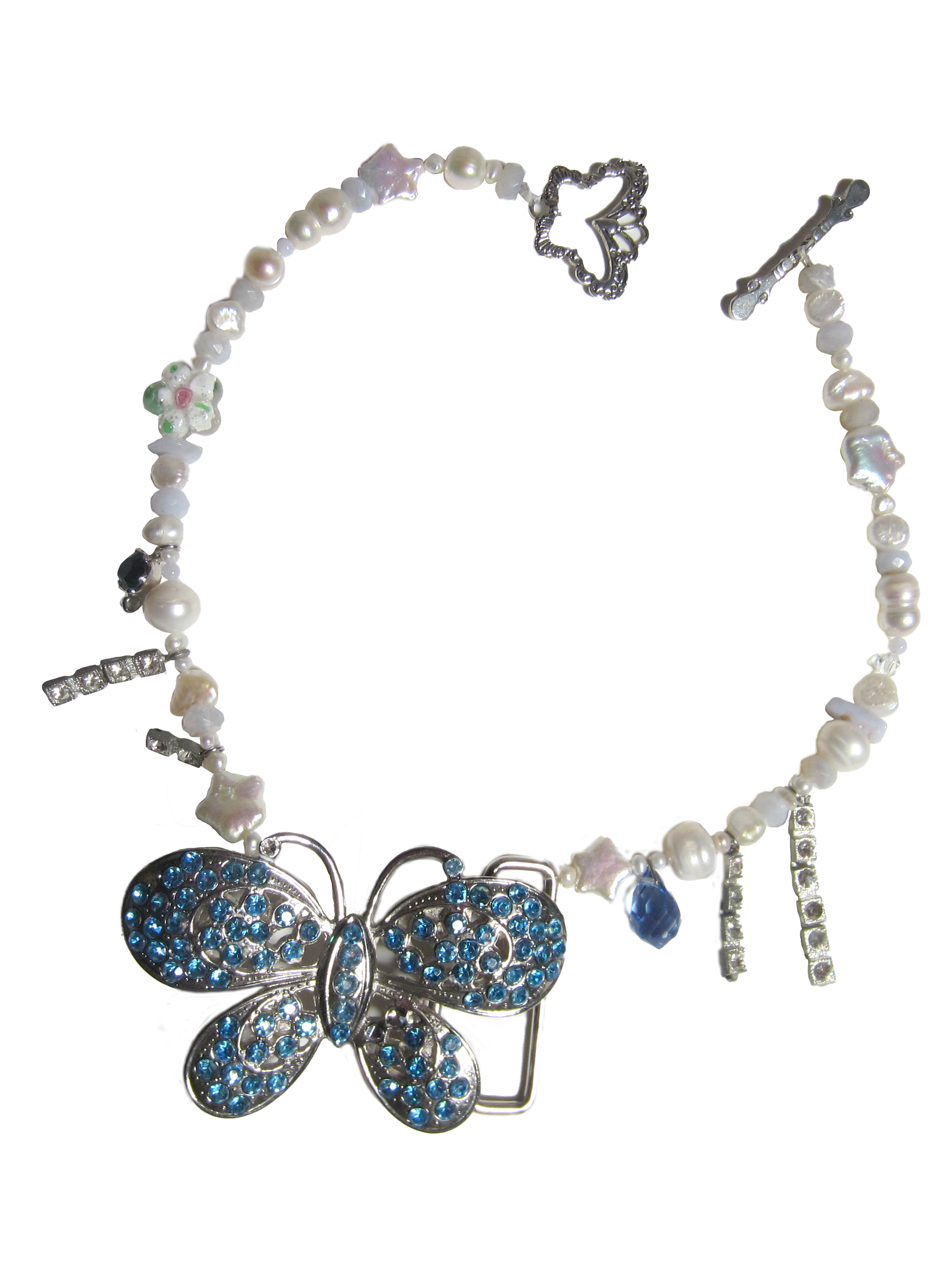 vintage rhinestone butterfly belt buckle, fresh water pearl , butterfly clasp , sourced rhinestone charms